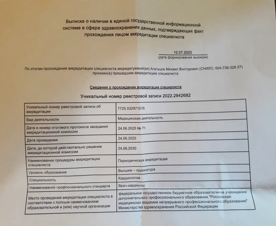 Данные сертификата специалиста – специальность, срок действия сертификата, соответствие занимающей должности.